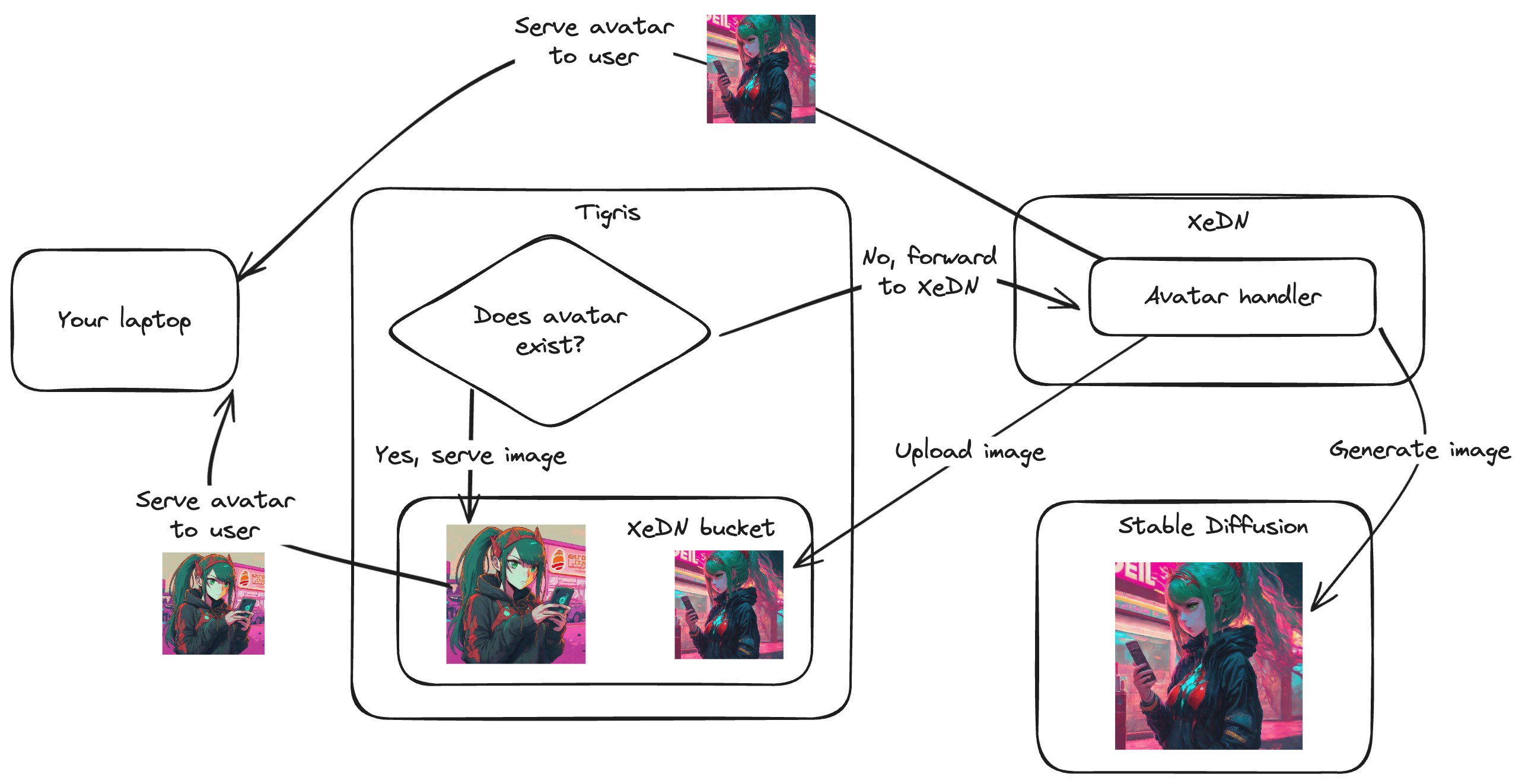 This let me load all of the existing images in the local cache into a Tigris bucket and then if the request hits XeDN, upload an avatar to take its place.