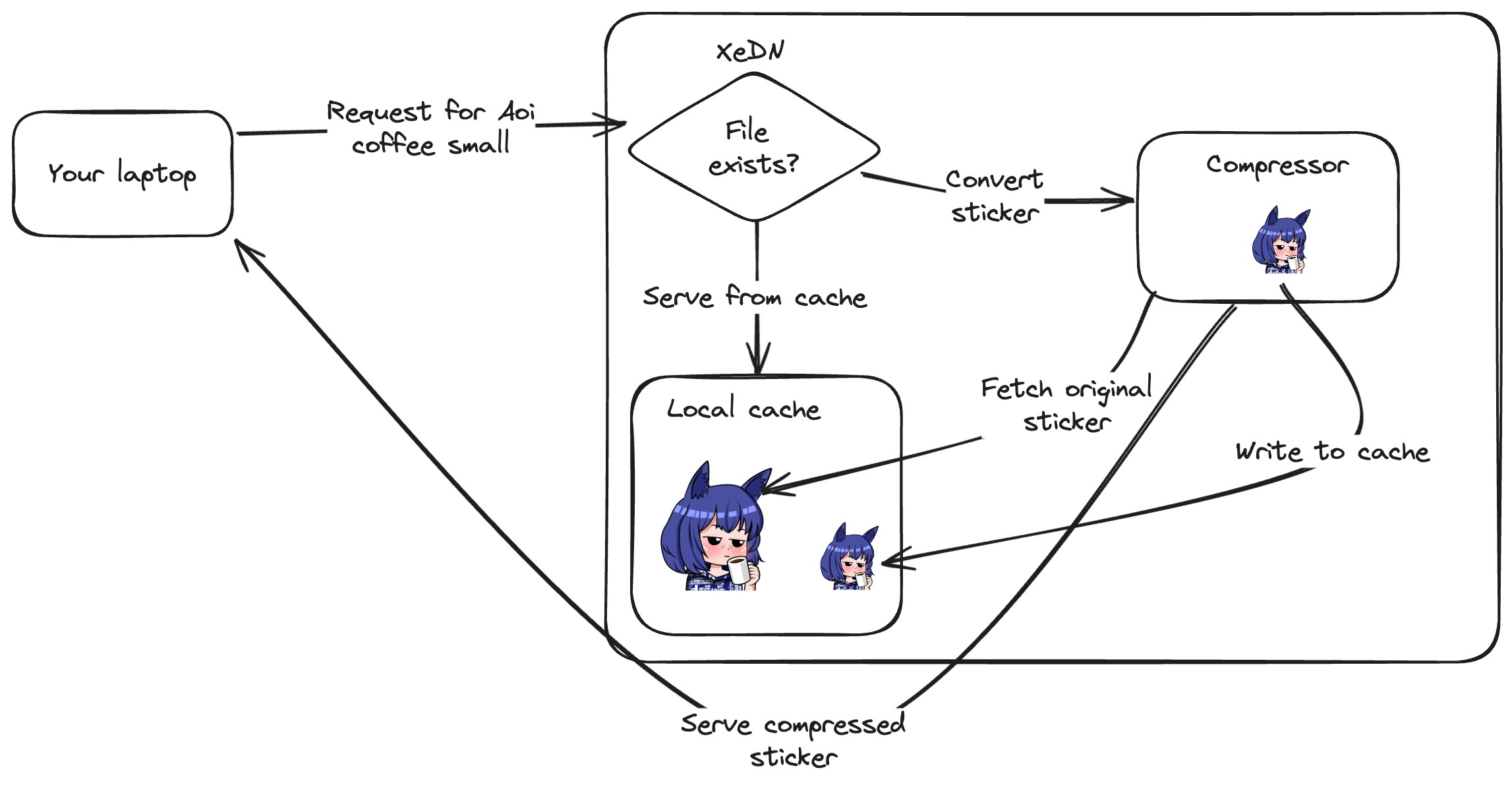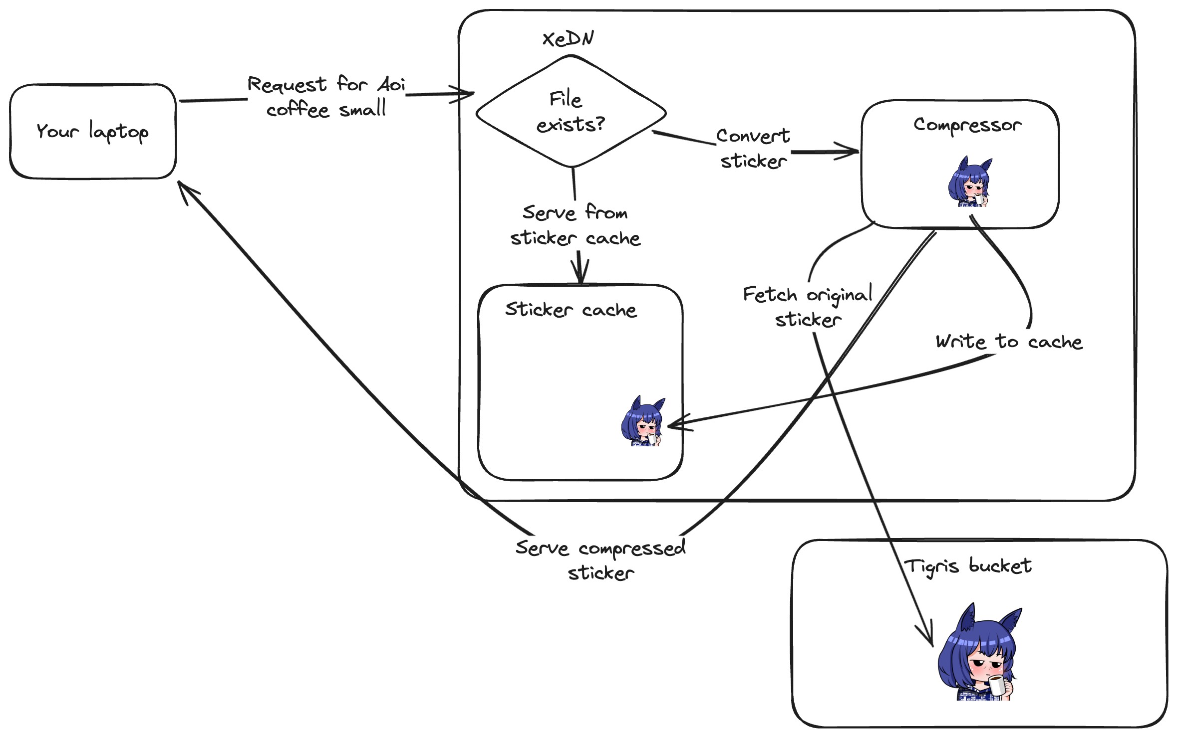 However, since I'm just going to be having most of the same behavior of XeDN's local cache, I can cheat and fetch the sticker URL from Tigris and then process it. This means that I can keep the same URL structure and not have to change anything in the posts that I've already written.