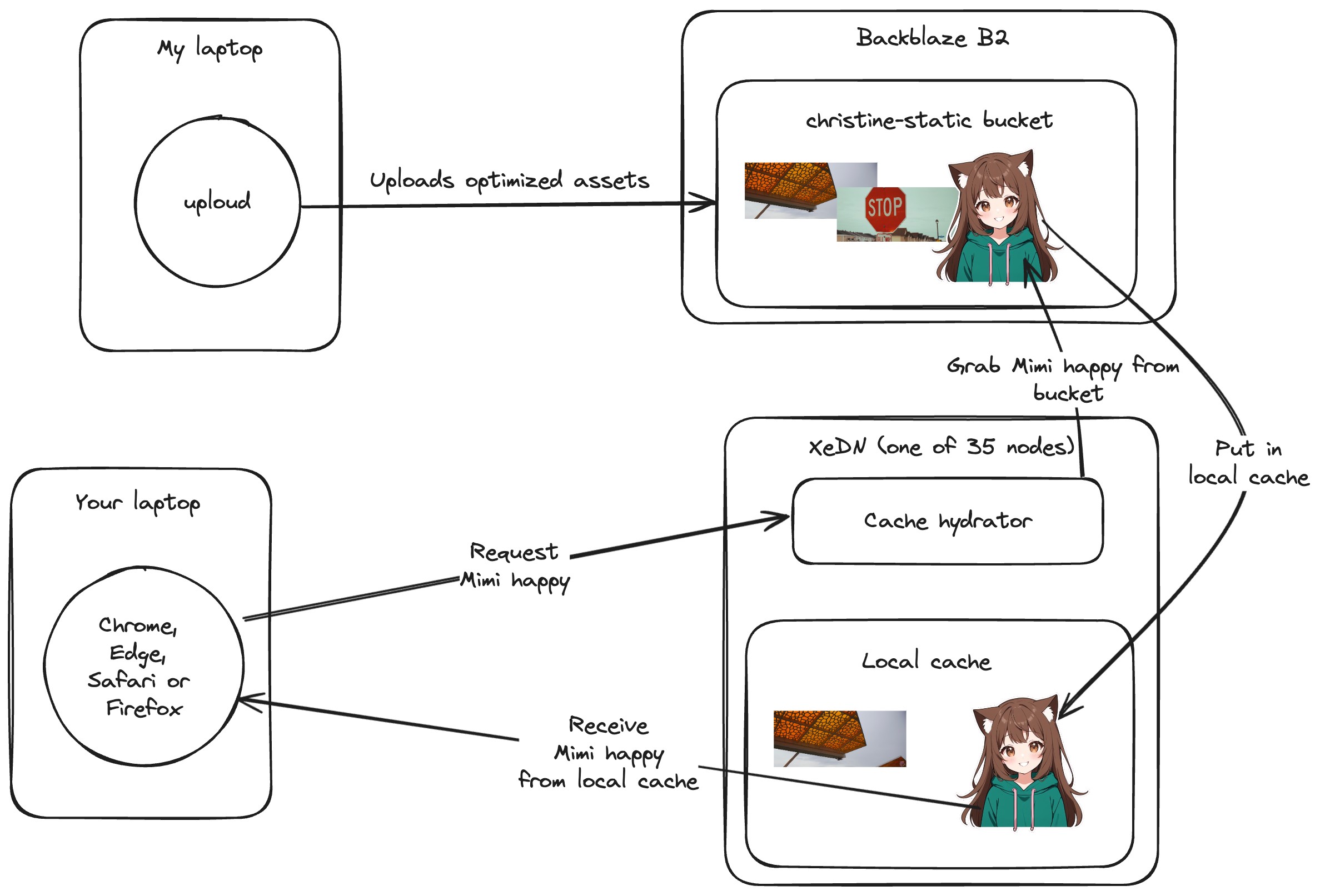 My laptop optimizes and uploads assets to the bucket, and then XeDN caches the assets people actually use in that region. This means that if you're in Berlin and nobody else has requested an asset from Berlin before, it'll take a moment to get the asset from wherever Backblaze B2 is storing it. If you're in Berlin and someone else has requested the asset from Berlin before, then you'll get the asset from the local cache.