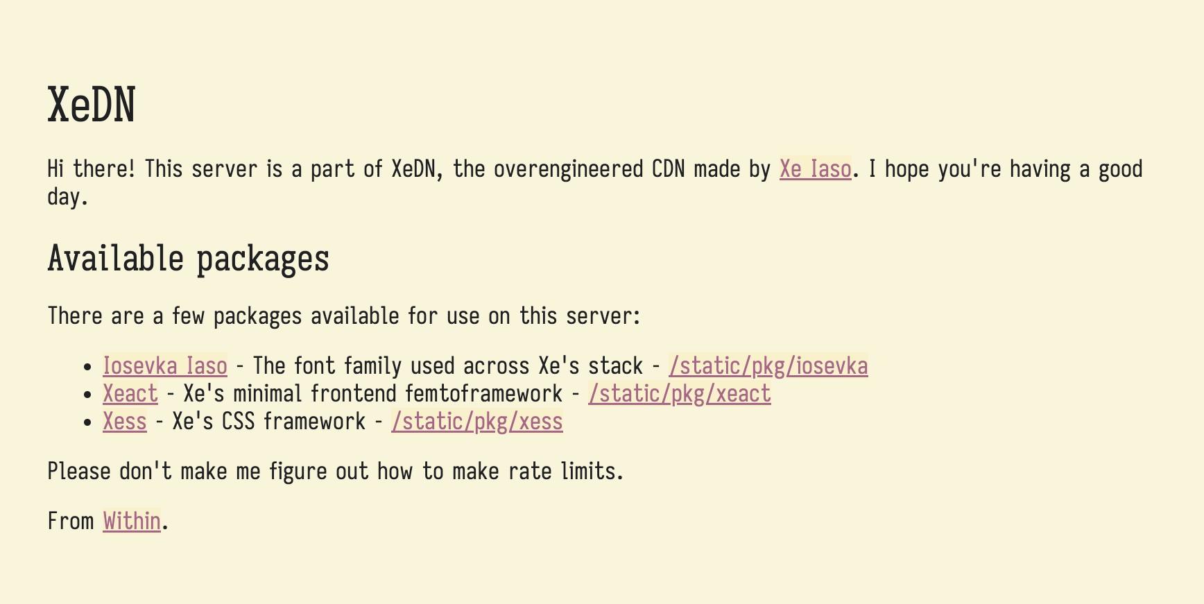 XeDN is many things, but the main thing that it's become is a burden to maintain. I like having my own infrastructure power my website as much as humanly possible, but at some point something's got to give. I've been running into a lot of subtle issues with XeDN that I'll get into more details about as this article goes on.